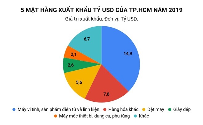 Năm 2019, TP.HCM có 5 mặt hàng đạt giá trị xuất khẩu trên 1 tỷ USD. Trung Quốc là thị trường xuất khẩu lớn nhất của TP.HCM với kim ngạch trên 8 tỷ USD.